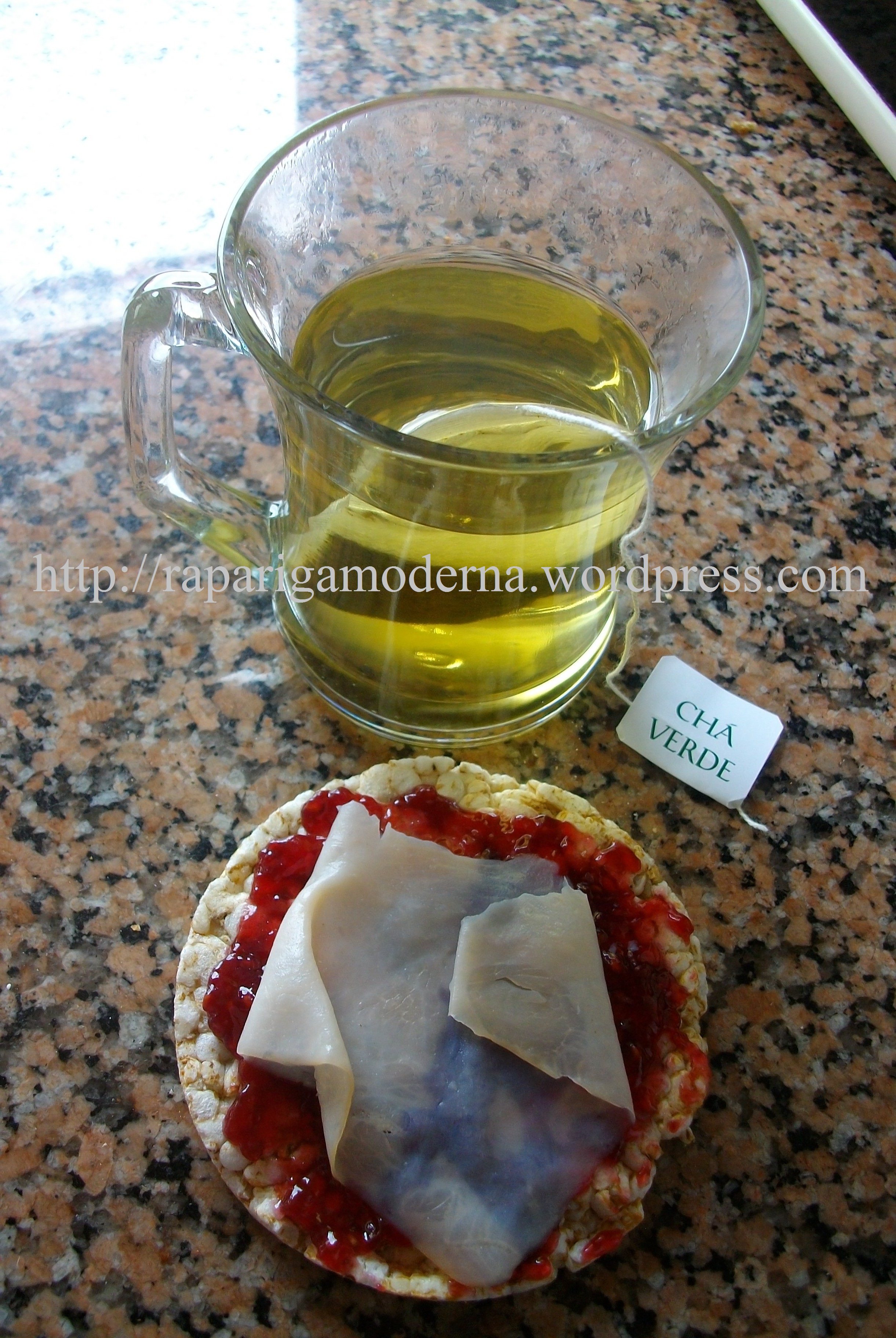 Chá verde ao natural + Bolacha de arroz recheado com doce de framboesas (sem adição de açúcar) e fiambre de peru.